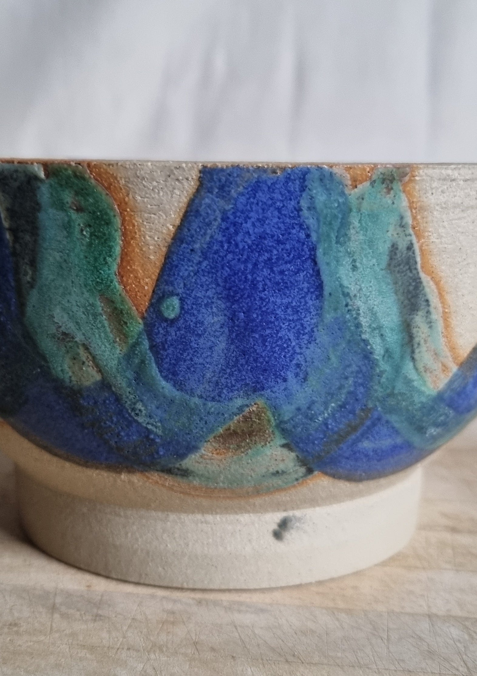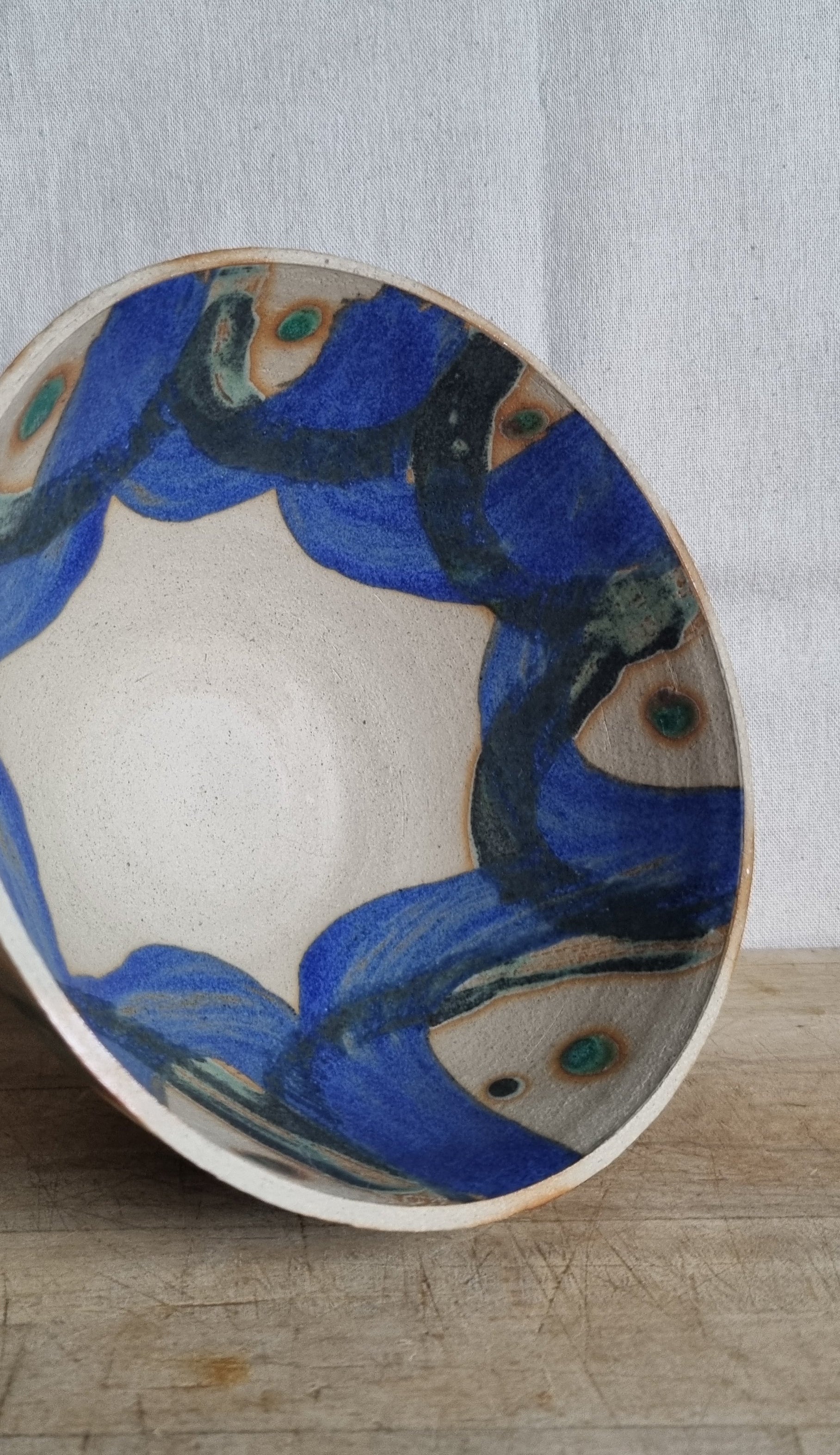 A good size bowl, hand thrown on the wheel. Decorated with bunting of green and blue glazes.